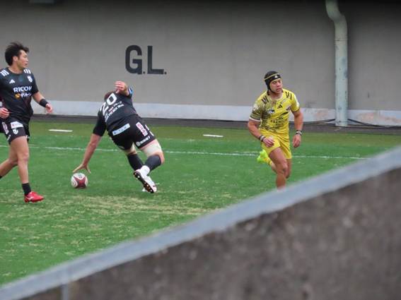 After the restart following the penalty goal, WTB TAIRA caught the kickoff deep in his own half and immediately launched a counterattack. TAIRA then stepped past 5-6 defenders, gaining about 50m in one go. From here, the Black Rams continued their attack in the opposition’s territory. Finally, the Backs created numerical superiority on the left side, and FB LUCAS scored a try in the left center of the opposition’s in-goal area.