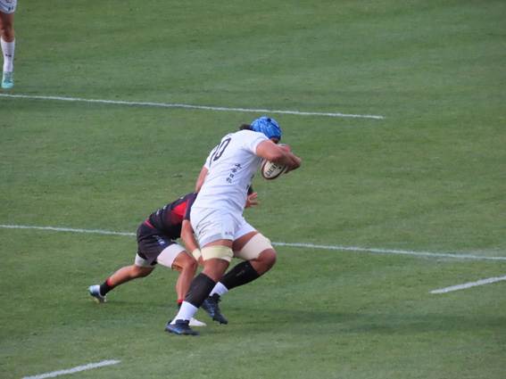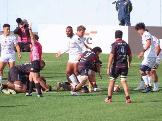 During this period, D-Rocks’ substitute players made their presence felt. Particularly notable was the breakthrough power of No. 8 IOANE, pictured above. Receiving the ball on the right wing, he shook off 3 opposing defenders, charged towards the try line, and finally connected with a follow-up offload pass to another substitute, scrum-half KONISHI. KONISHI then scored a try right under the opponent’s goalposts.
