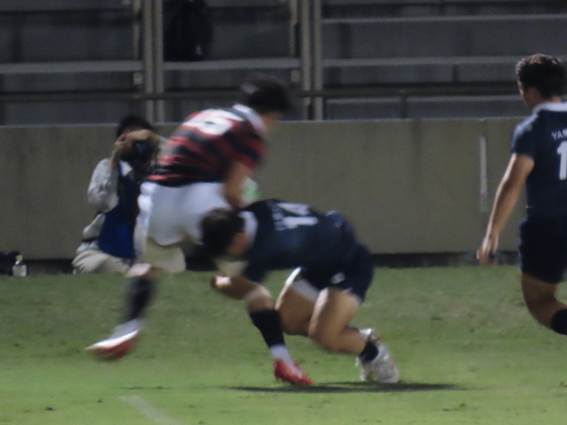 However, Rikkyo University’s backs then created a highlight moment. WTB MURAKAMI caught the ball in his own half and launched a counterattack. Waseda’s defense initially brought MURAKAMI down, but Rikkyo won the scrum, restarted the attack, shifted play to the left, and WTB SHIBUYA drove deep into the opposition’s in-goal area. Here, Waseda’s last line of defense, FB YAZAKI, made a tackle on Rikkyo’s SHIBUYA, pushing him out of bounds and preventing the score.
