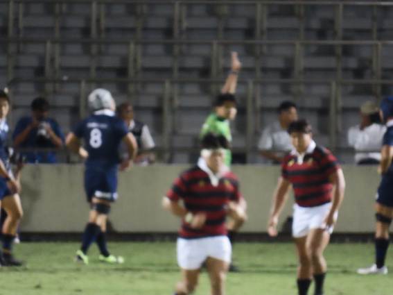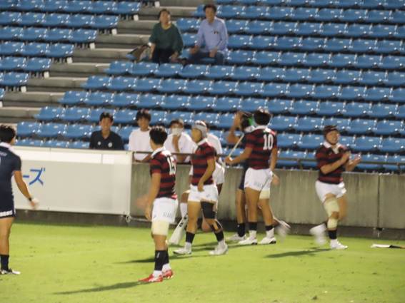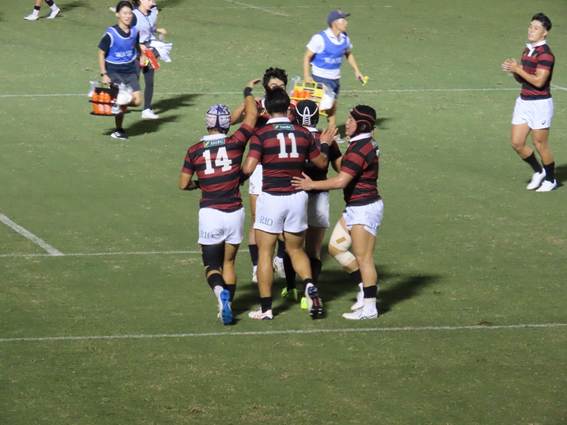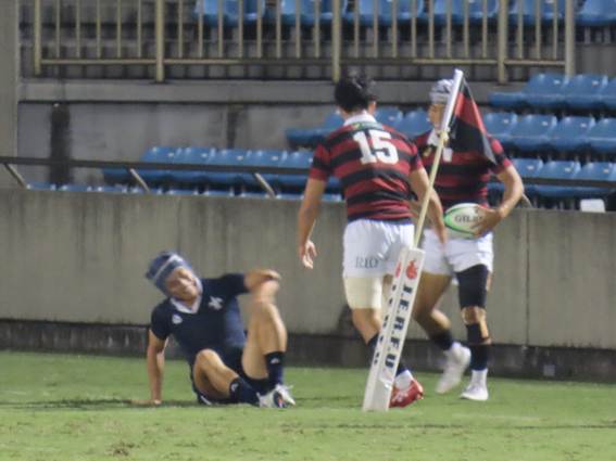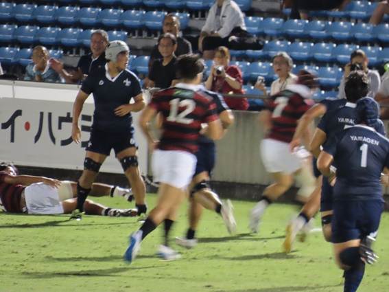 Waseda then launched an attack deep in the opposition’s territory. The ball moved from SO Hattori to FB Yazaki, who displayed his speed, evading two defenders to score a try in the left center of the opposition’s in-goal area.