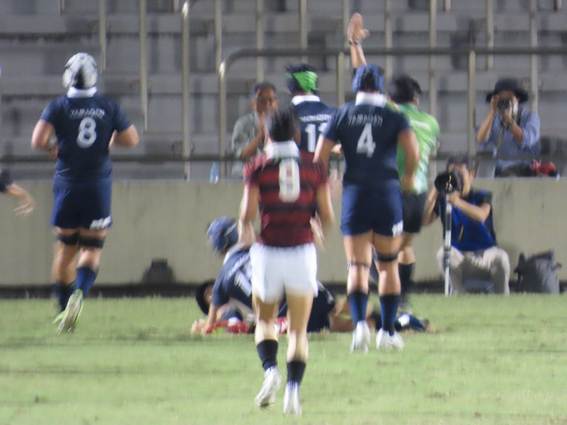 Rikkyo adopted a defensive strategy similar to the first half, pressing forward early to disrupt attacks. Waseda countered by kicking behind the advancing defense. Once again, Waseda FB YAZAKI caught a kick behind the defense, evaded the opposition, and scored his 4th try of the day in the right center of the in-goal area.