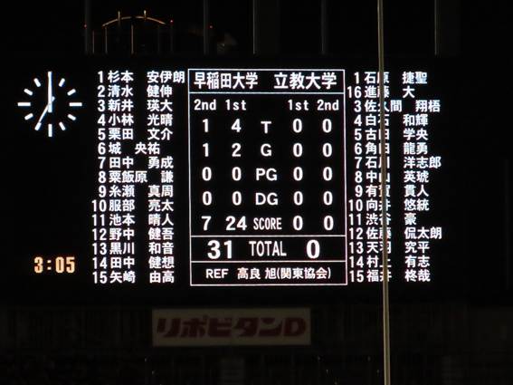 The conversion kick after the try was successful, bringing the score to 24-0. With this try, Waseda FB Yazaki scored his 3rd of the first half, achieving a hat trick early on.